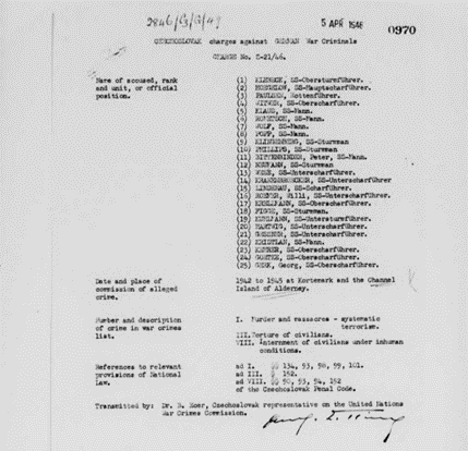 For background, these documents were officially submitted by the state concerned to the UNWCC. That Commission was hosted, staffed, and chaired by the UK which also took part as a member state in the Commission’s decision on the cases. Commission chairmen included a former President of the International Court of Justice and a former Master of the Rolls. The French cases were signed by Andre Gros, a member of the International Court of Justice, and the Czech case by Bohuslav Ecer, also a judge at the International Court of Justice. As far as it can be seen, so far almost all those charged were put on lists of accused war criminals although some were listed as witnesses.