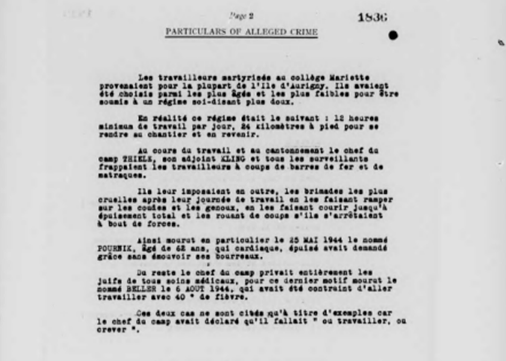 Charge concerning the Mariette prison, the Mariette school in France, and transport of 650 French Jews to Alderney and what happened: “extreme violence against Jewish workers.” Based on evidence retained in France by a Mr Henry Cohen of Paris.