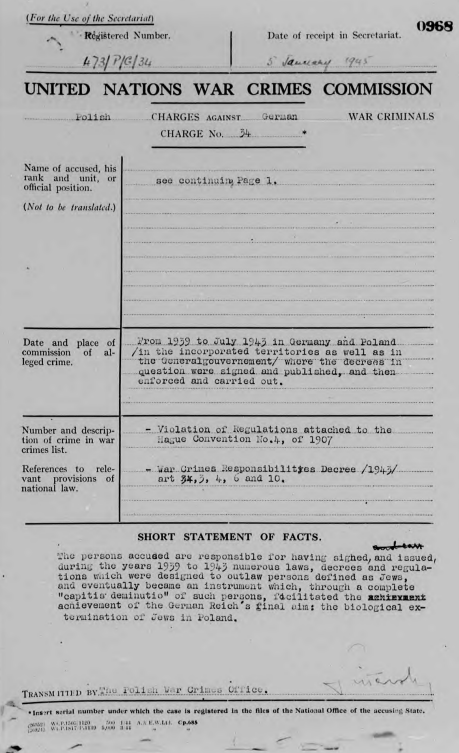 Poland charged Hitler with the “biological extermination of the Jews in Poland,” invoking the Fourth Hague Convention of 1907 and Polish national war crimes decrees.