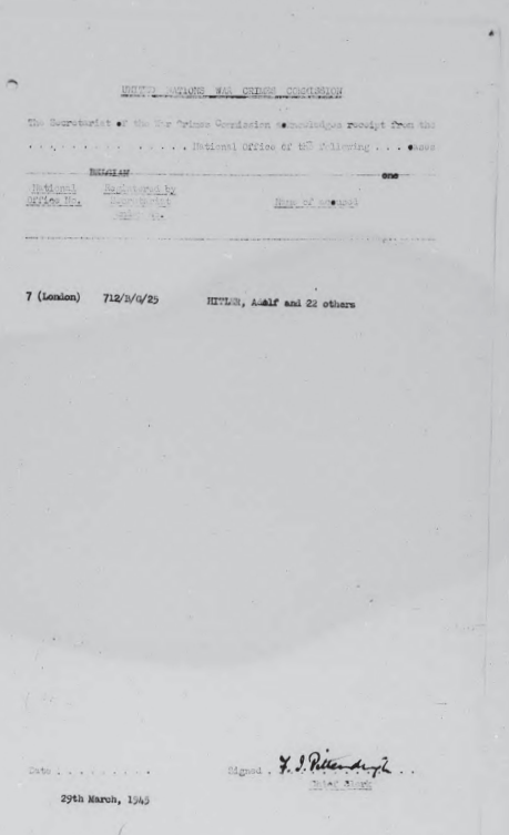 Each indictment was reviewed by the UNWCC’s Committee on Facts and Evidence, which determined they met the prima facie standard for prosecution. Hitler’s name subsequently appeared on official UNWCC lists of war criminals subject to arrest and trial in domestic courts—a sitting head of state formally designated for prosecution by foreign domestic jurisdictions.